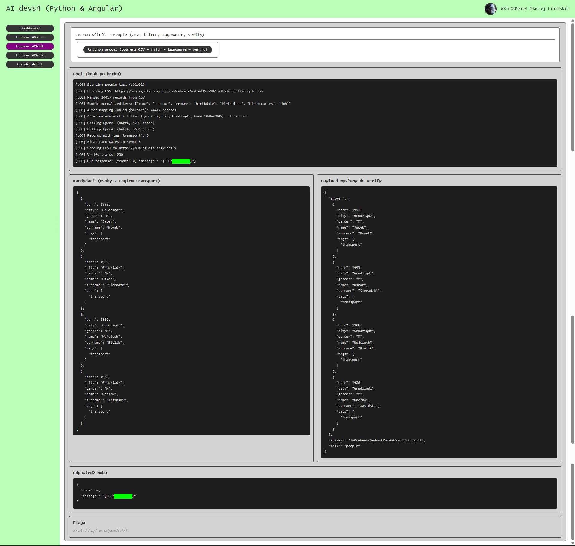 Zadanie polegało na pobraniu zewnętrznego zbioru danych zawierającego listę osób współpracujących z systemem, a następnie przeanalizowaniu rekordów w celu wytypowania kandydatów spełniających określone kryteria demograficzne i zawodowe. Dane zostały przefiltrowane pod kątem płci, wieku wyliczonego na podstawie roku urodzenia oraz miejsca pochodzenia, a następnie opisy stanowisk pracy zostały sklasyfikowane przy użyciu modelu językowego poprzez przypisanie im zestawu zdefiniowanych kategorii zawodowych. Kluczowym elementem zadania było wykorzystanie mechanizmu strukturalnej odpowiedzi modelu (Structured Output), aby wymusić poprawny format JSON podczas tagowania zawodów. Po przypisaniu tagów wybrano wyłącznie osoby związane z branżą transportową i przygotowano wynikową listę rekordów w wymaganym schemacie danych, którą następnie przesłano do systemu weryfikacyjnego.